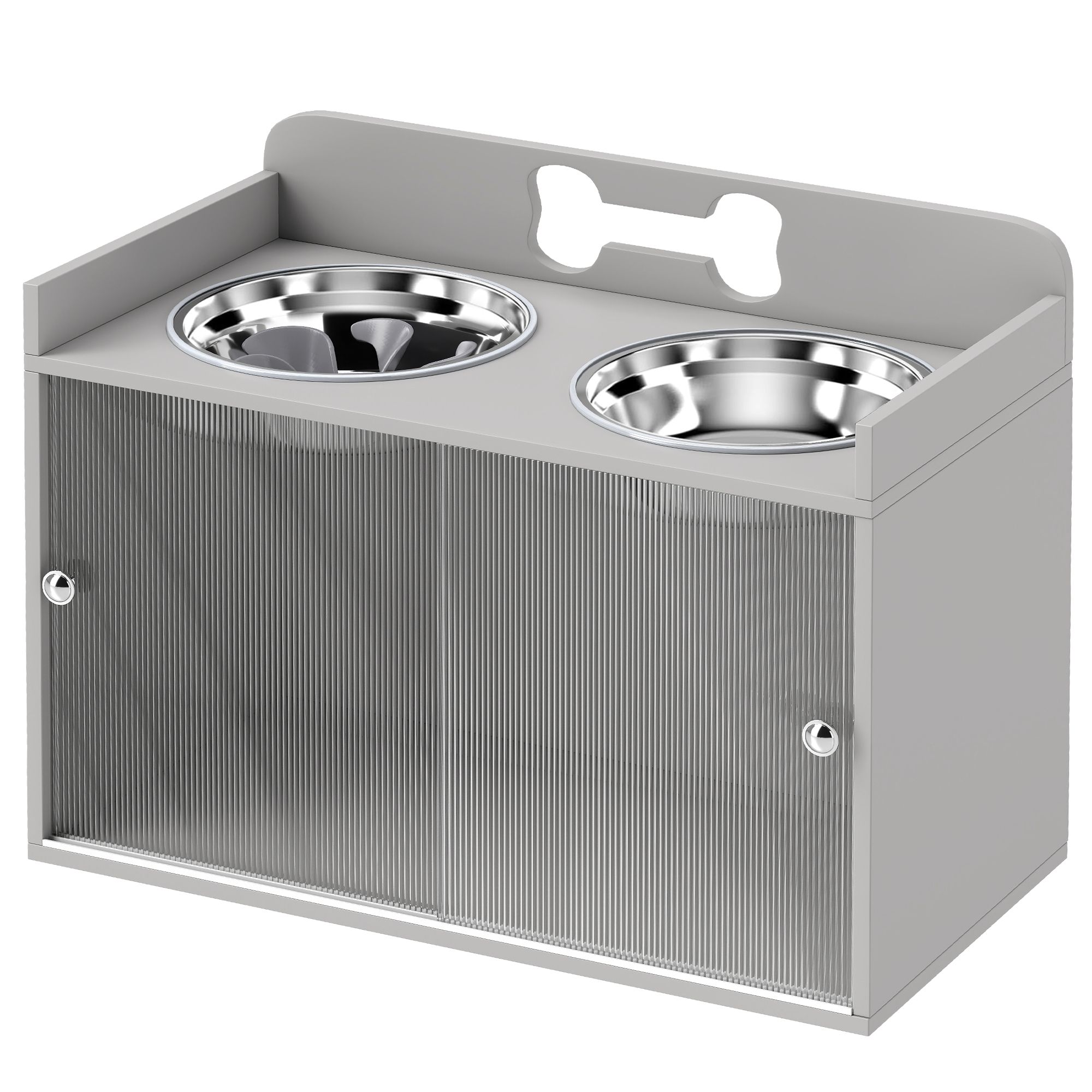 5.- Stylish Home Integration: The modern, minimalist gray design with cute bone cut-outs and semi-transparent acrylic doors makes the raised dog bowl stand a practical and attractive addition to any home decor.